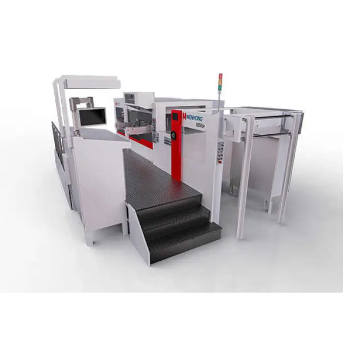 Key features include high precision cutting and creasing, fully automatic operation, fast production speed, and powerful pressure for efficient processing.