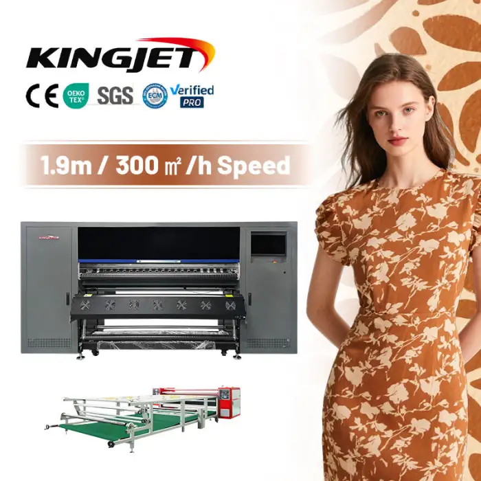 The printer is designed for high-quality printing on various textiles, including bedsheets, dresses, sportswear, and curtains.