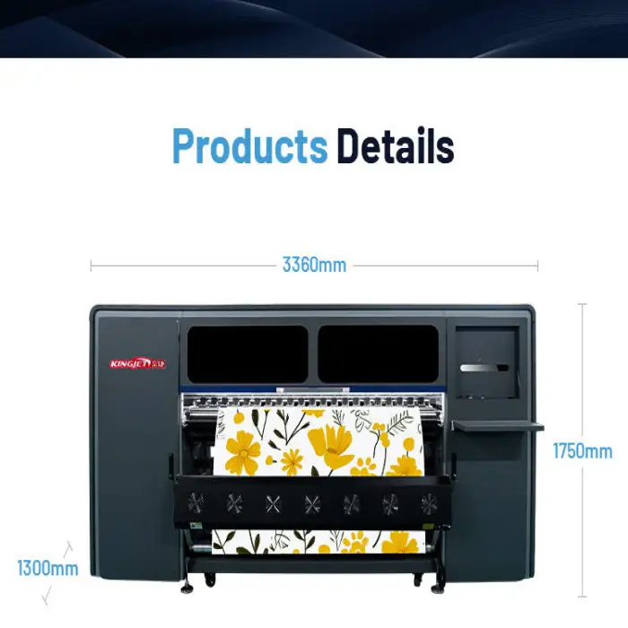 The printer has dimensions of 3360 mm in length, 1300 mm in width, and 1750 mm in height.