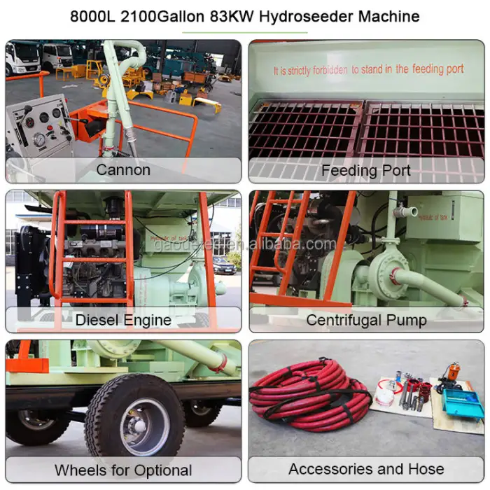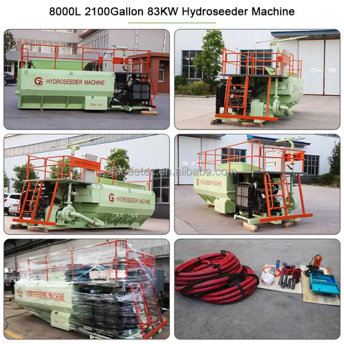 The 8000L Hydroseeder Machine has a tank capacity of 8000 liters, which is equivalent to 2100 gallons.