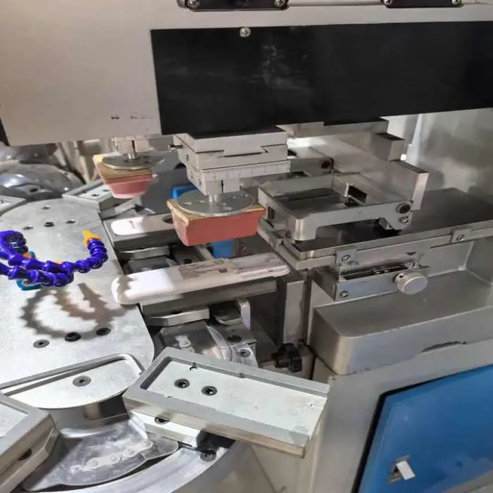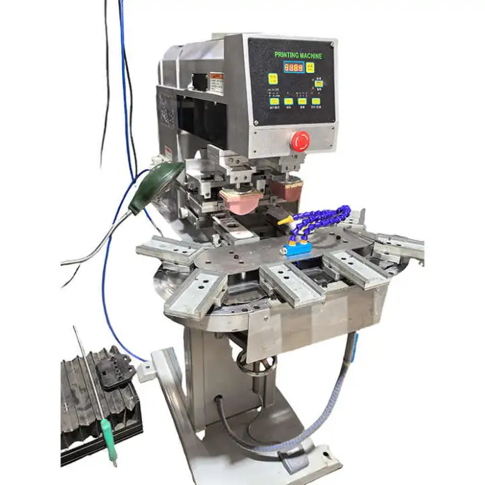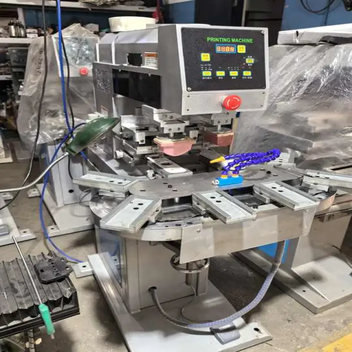 The machine supports pad printing with a flatbed printing plate type.