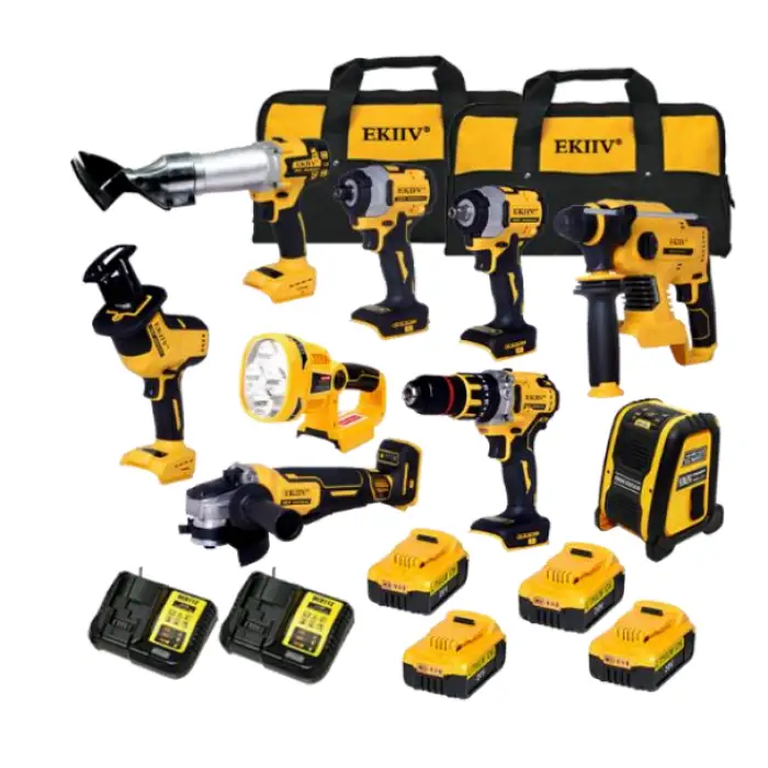 The kit includes a Cordless Brushless 13mm impact drill, a Cordless Brushless Impact Screwdriver, a Cordless Brushless Impact Wrench, a Cordless Brushless 5" Angle Grinder, a Cordless Brushless 20mm Rotary Hammer, a Cordless Brushless Saber Saw, a Cordless Speaker, a Cordless LED Light, and Cordless Brushless Scissors.