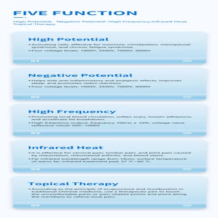 The 9000V Electric Potential Therapy Machine is designed to enhance body health, relieve pain, support better sleep, and promote overall wellness through high potential and negative potential therapy.