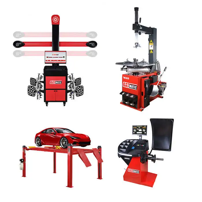 The full set includes a tire balancer, tire changer machine, and a 4 post car lift, along with an advanced wheel alignment system.