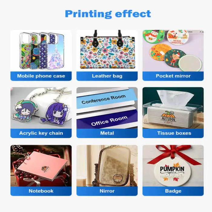 Ideal applications include custom phone cases, personalized golf balls, bottle and small-gift printing, decorative prints on wood and glass, and short-run labels or cards where high-quality, full-color UV prints are desired.