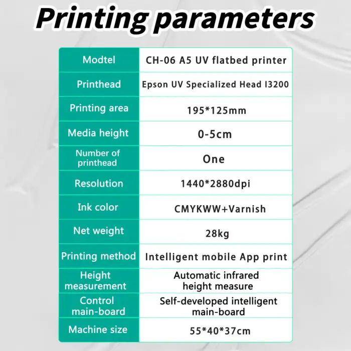 The dimensions of the A5 Automatic UV Printer are 55 cm (L) x 40 cm (W) x 37 cm (H).