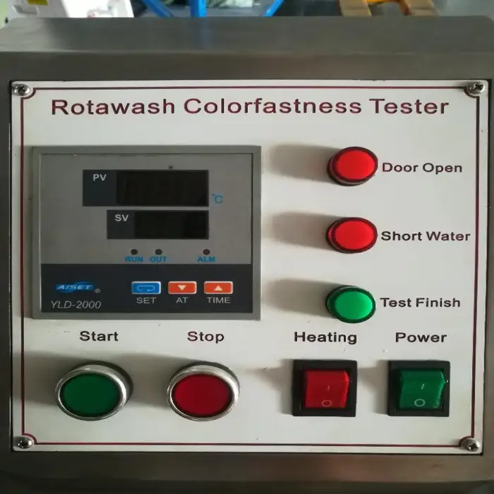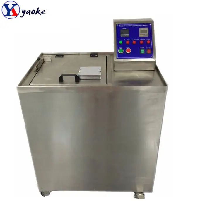The machine simulates washing conditions through controlled temperature, centrifugal force, and timed cycles, accurately replicating the effects of washing on fabric color.