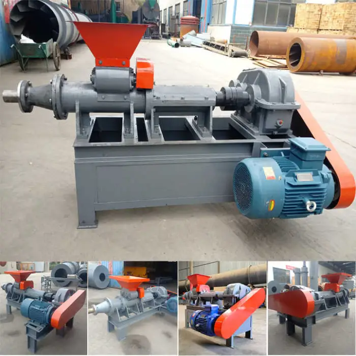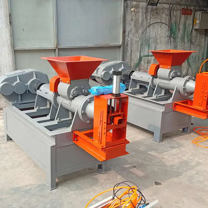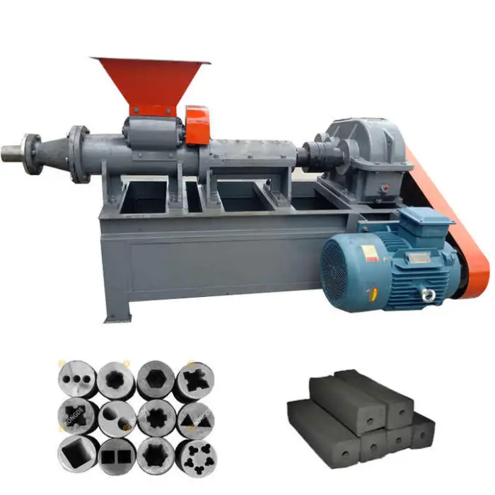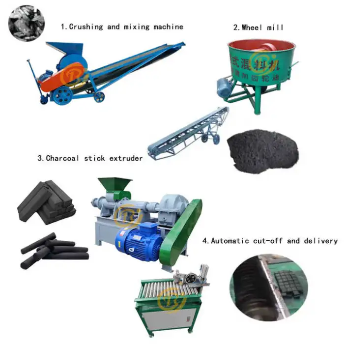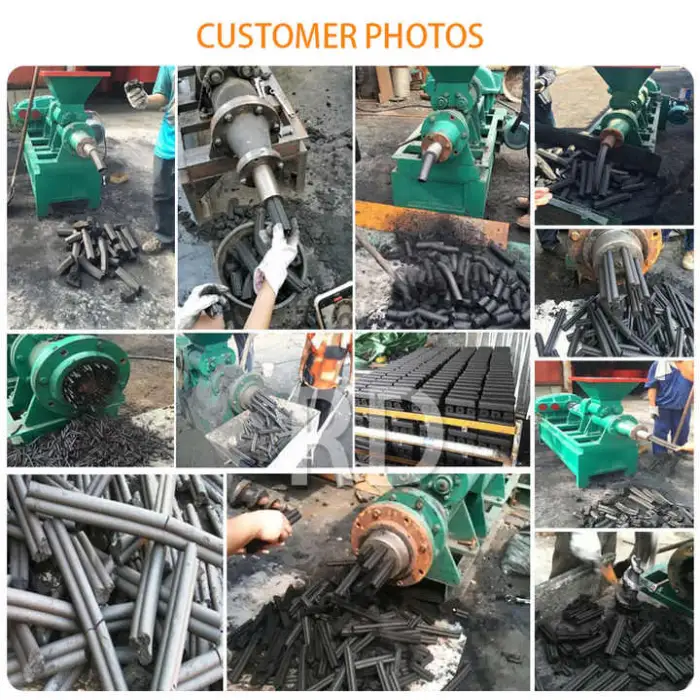 The machine can produce finished products like BBQ charcoal sticks and various fuel briquettes.