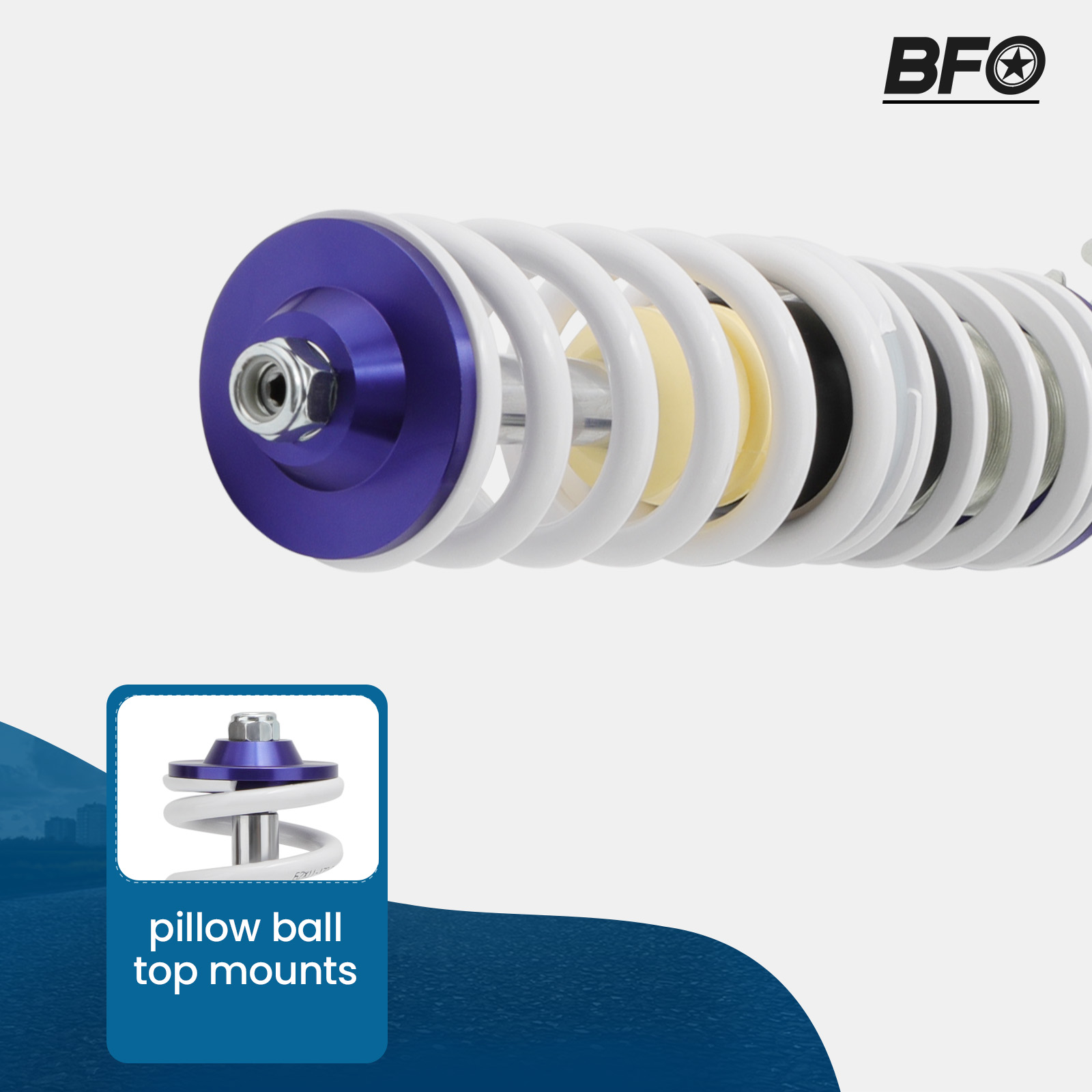 The coilovers feature weight-saving aluminum components and heavy-duty steel lower mount brackets.