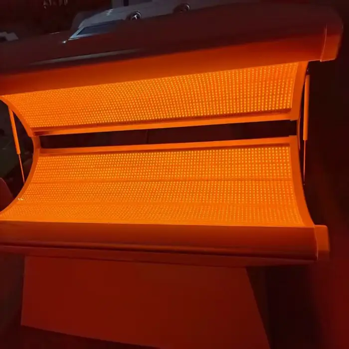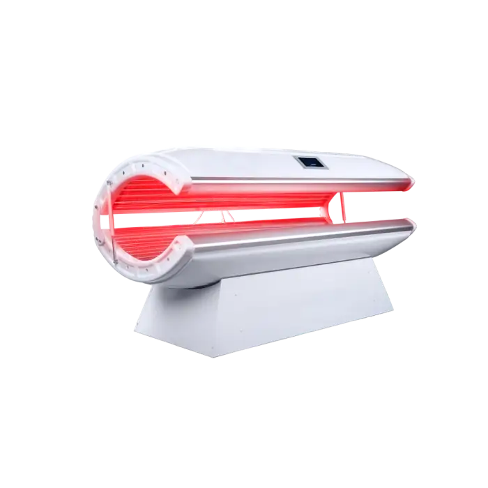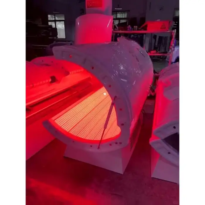 The therapy pod utilizes advanced LED technology, emitting specific wavelengths of light (660 nm, 850 nm, 633 nm, and 940 nm) to penetrate the skin and tissues, promoting pain relief and skin rejuvenation.