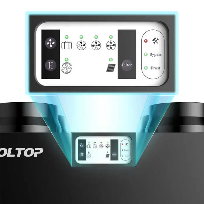 The crossflow heat exchanger optimally transfers heat from the outgoing air to the incoming fresh air, greatly enhancing the system's energy efficiency.