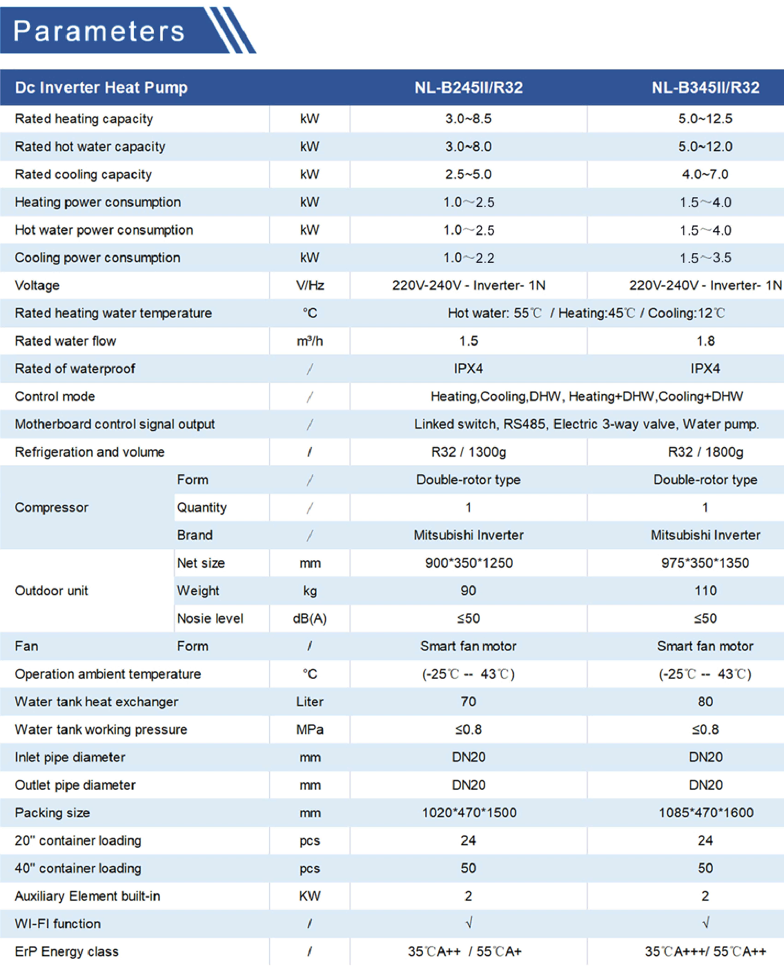 The NL-B245II/R32 Air Source Heat Pump has an energy efficiency rating of A+++, ensuring substantial energy savings while delivering effective heating, cooling, and hot water.