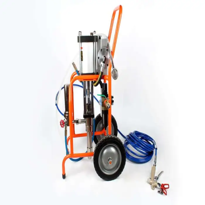 An air-powered airless paint sprayer uses a pneumatic motor to drive a high-pressure piston or diaphragm pump that forces paint through a fine spray tip. It is 'airless' at the nozzle (no added atomizing air) so it produces a high-pressure, uniform spray for smooth, even coats while the compressed air only powers the pump mechanism.