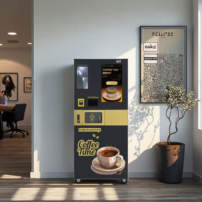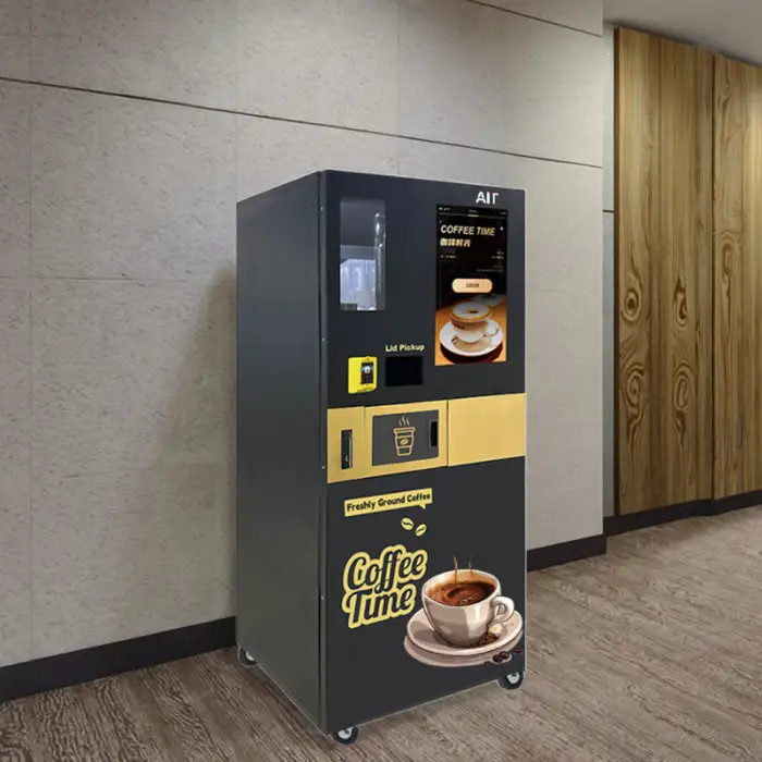 The vending machine features a user-friendly 22-inch touchscreen display that allows guests to easily select their desired coffee options.