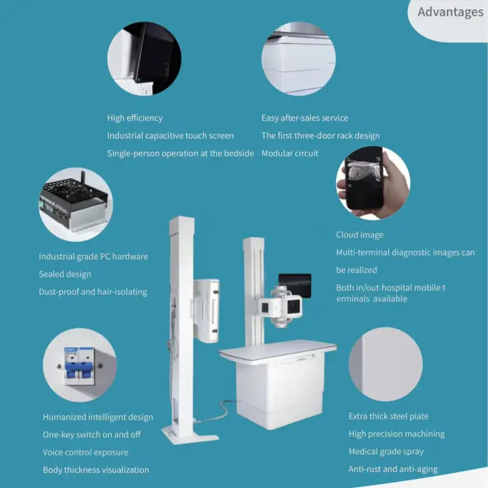 Key features include high-quality imaging, portable design, online technical support, fast X-ray photography, and durable construction.