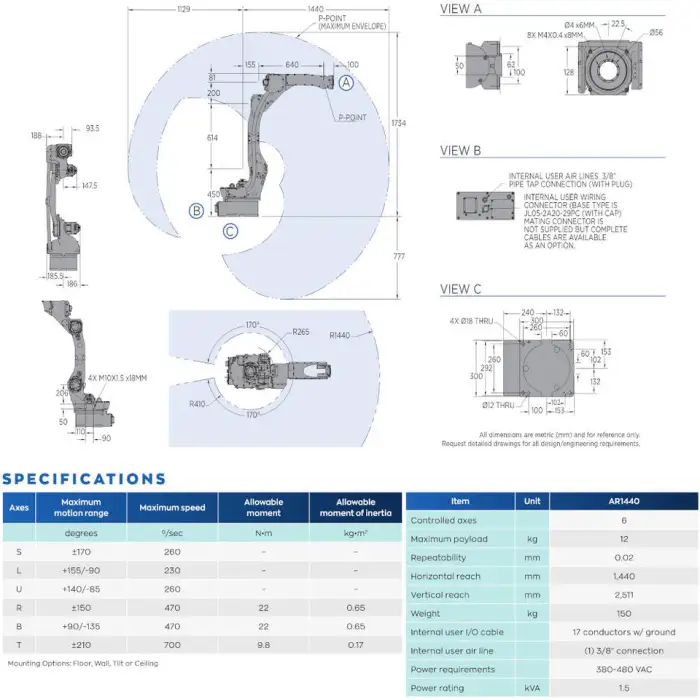 The AR1440 welding robot features an arm length of 1440 mm.