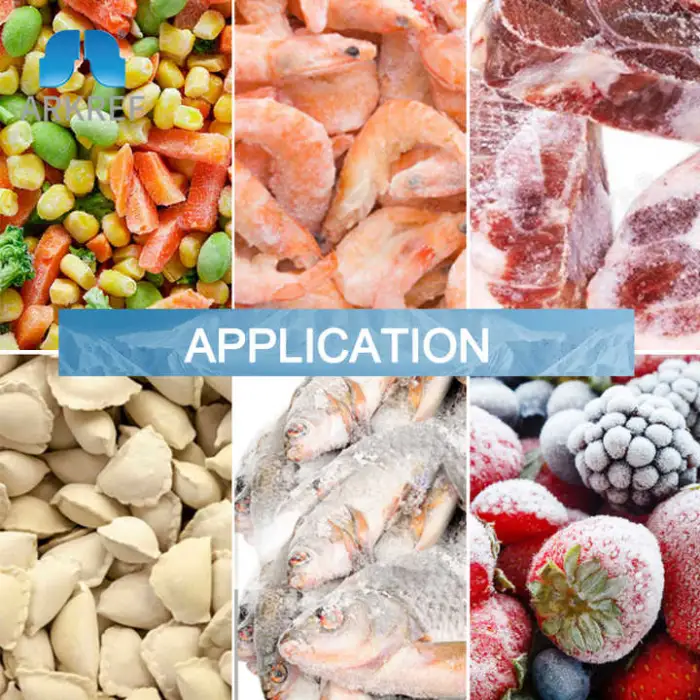 This machine is suitable for freezing a variety of food products including meat, seafood, fruits, vegetables, and ready-to-eat meals.