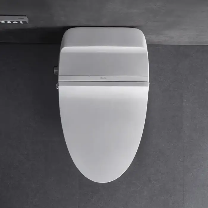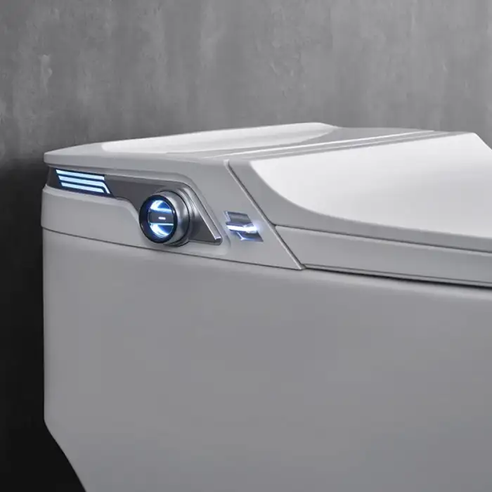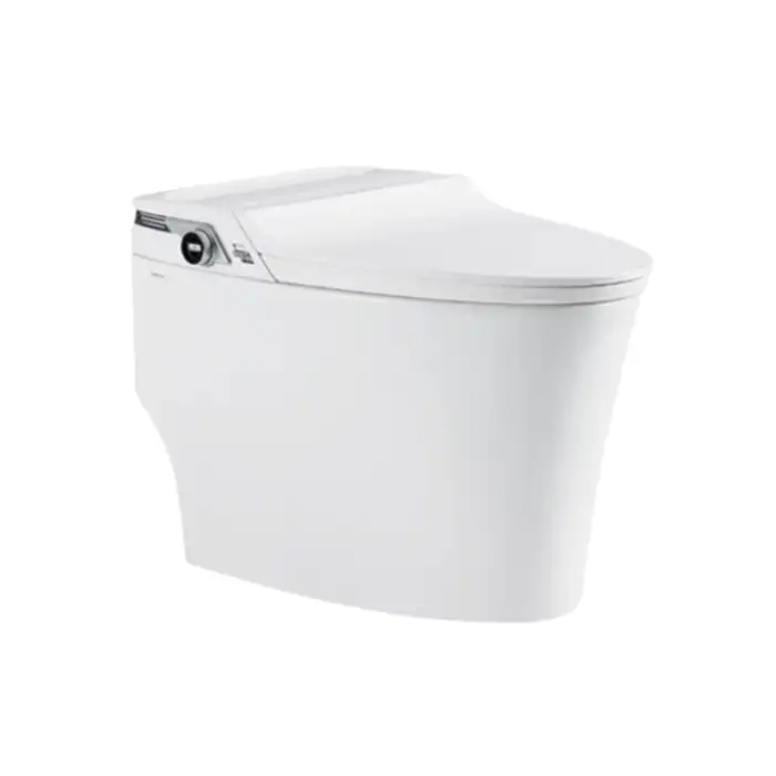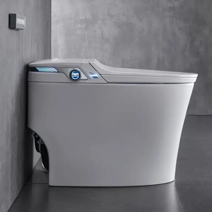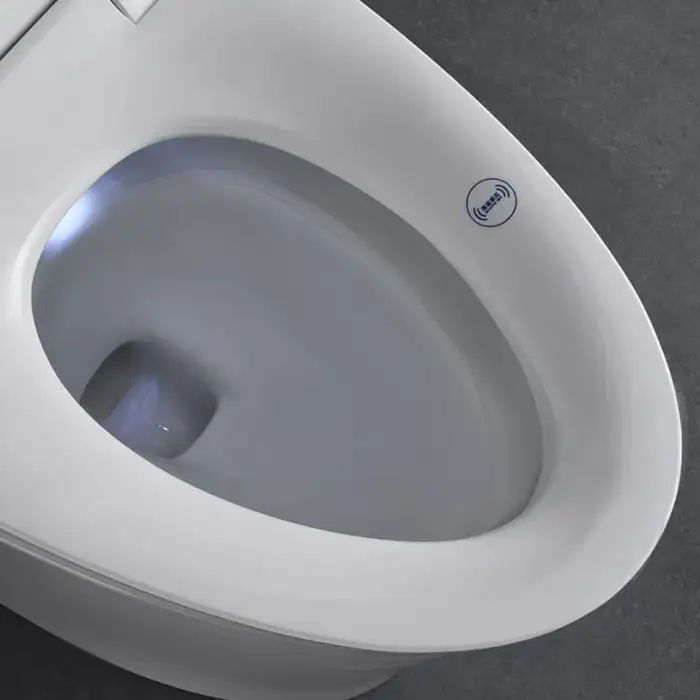 The toilet uses sensors to detect when a person approaches, automatically opening the lid for a hands-free experience. After use, the lid closes automatically, enhancing convenience and hygiene.