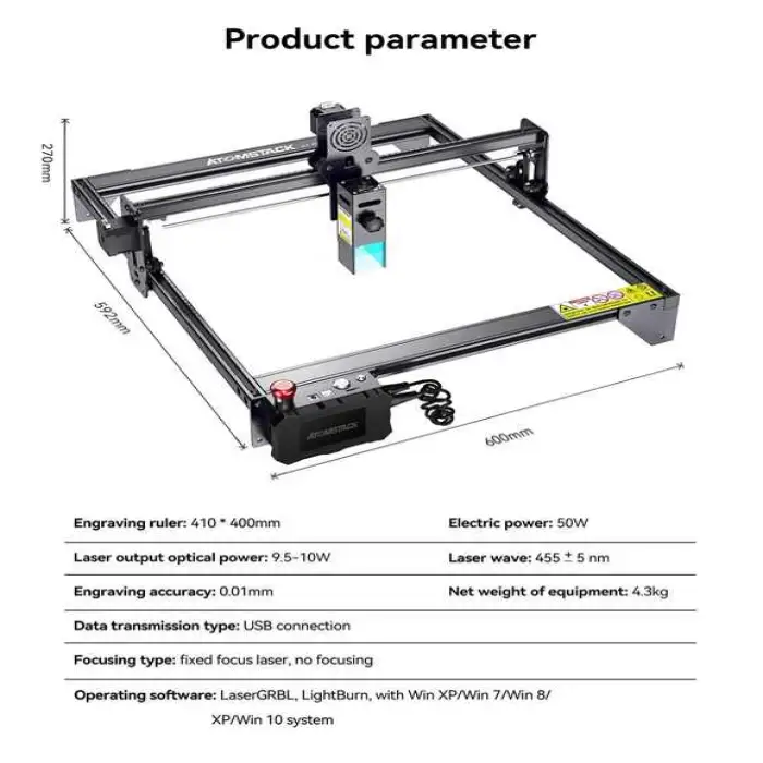 The dimensions of the ATOMSTACK X7 S10 Pro are 570 x 600 x 270 mm.