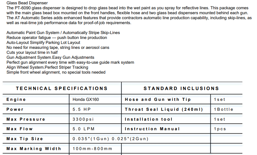 The maximum working pressure of the PT-6090AT is designed to accommodate a variety of line striping applications, ensuring consistent and high-quality results.