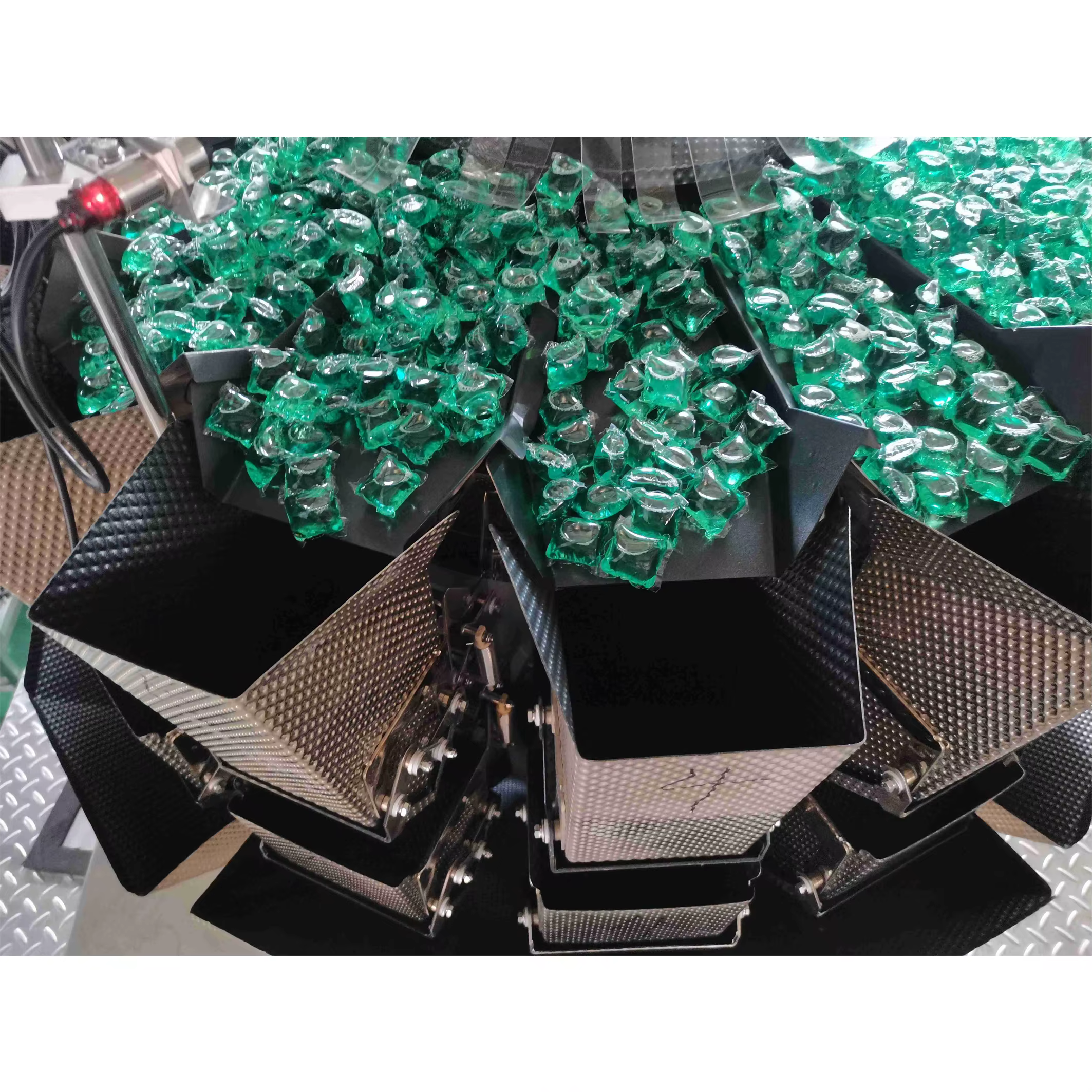 This machine is suitable for packing laundry detergent pods, household cleaning products, food items, chemical products, textiles, and hardware items.