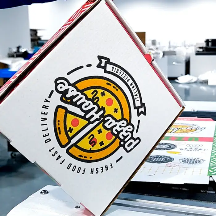 Yes, the machine is suitable for custom printing on pizza boxes as well as other paper products.