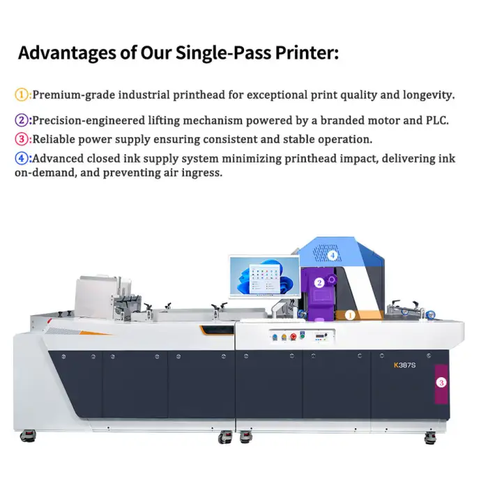 The printer operates with Windows 10 and features a PLC control system.