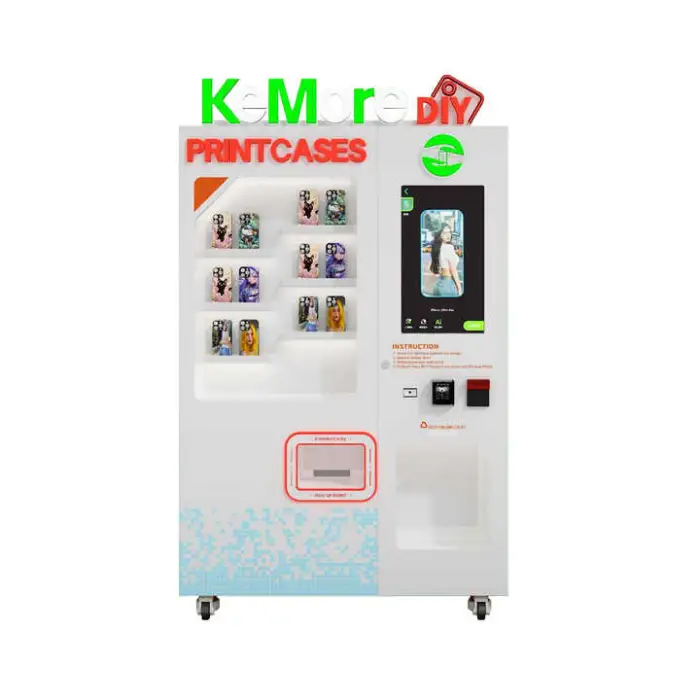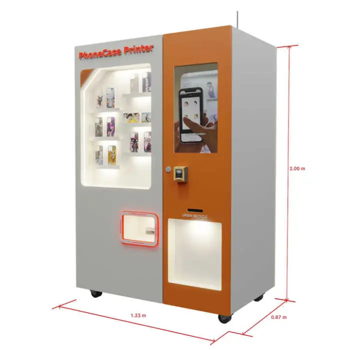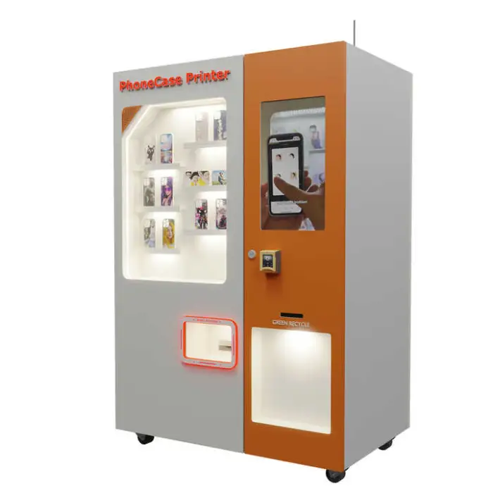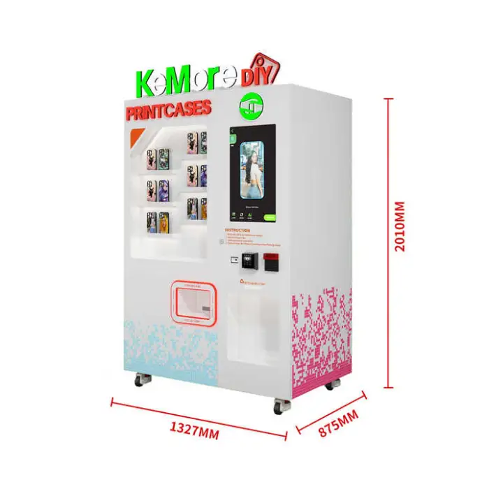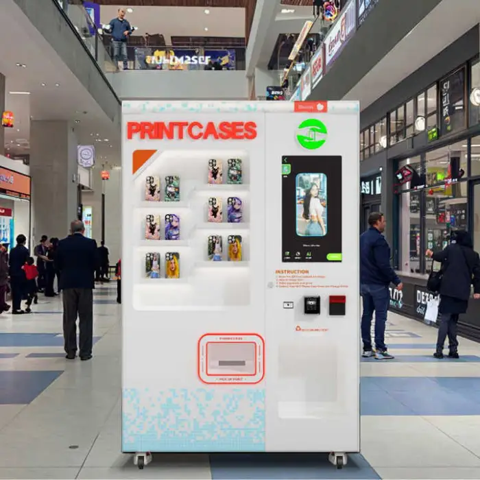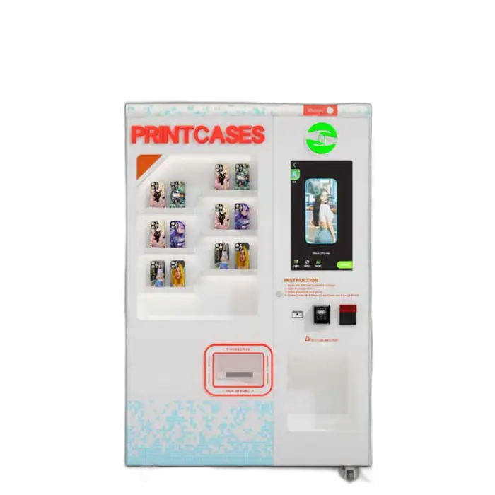 Customers use the 27-inch touchscreen to choose or create a design, pay via the machine’s payment options, and the machine prints and dispenses the finished case on the spot. The workflow is user-driven and designed for quick, on-the-spot personalization.