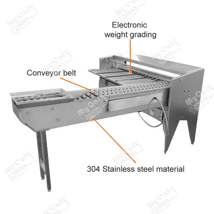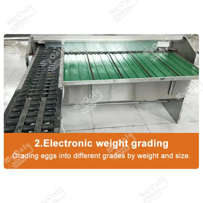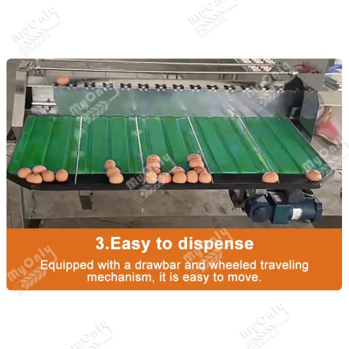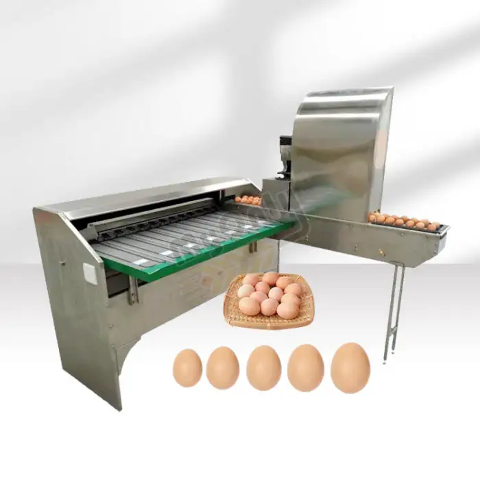 The machine features an adjustable grading system that can sort eggs into 5 different sizes.