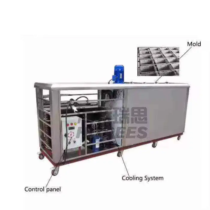 The machine produces large block ice, specifically designed for commercial use.