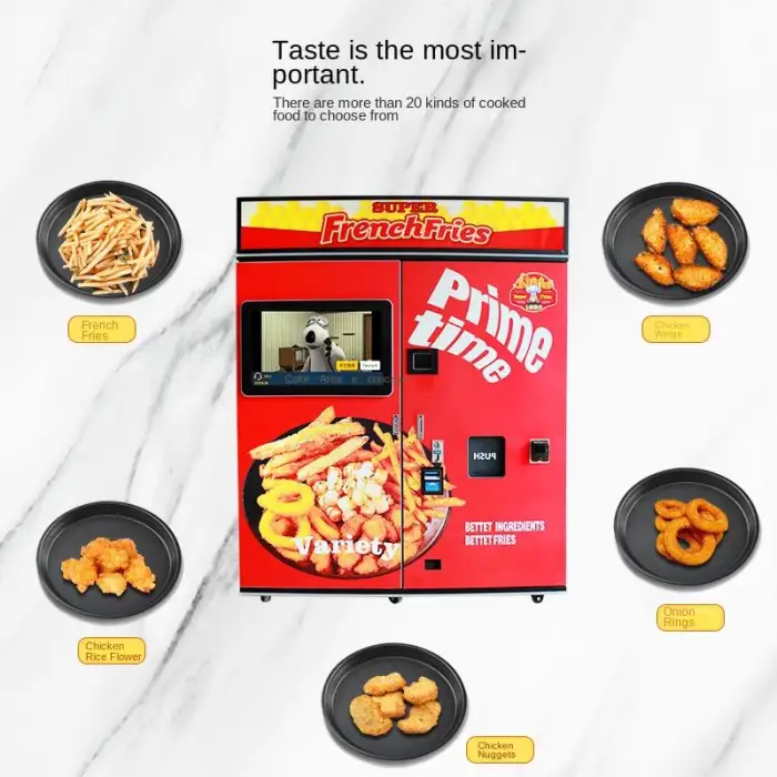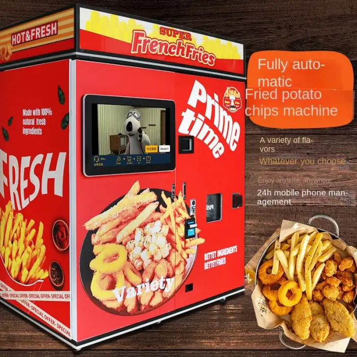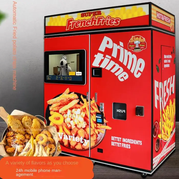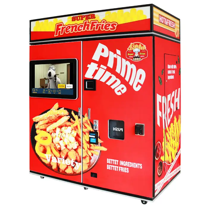 The vending machine serves hot, fresh French fries and fried chicken.