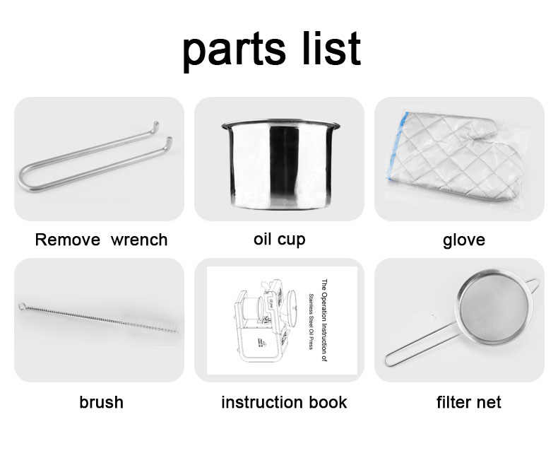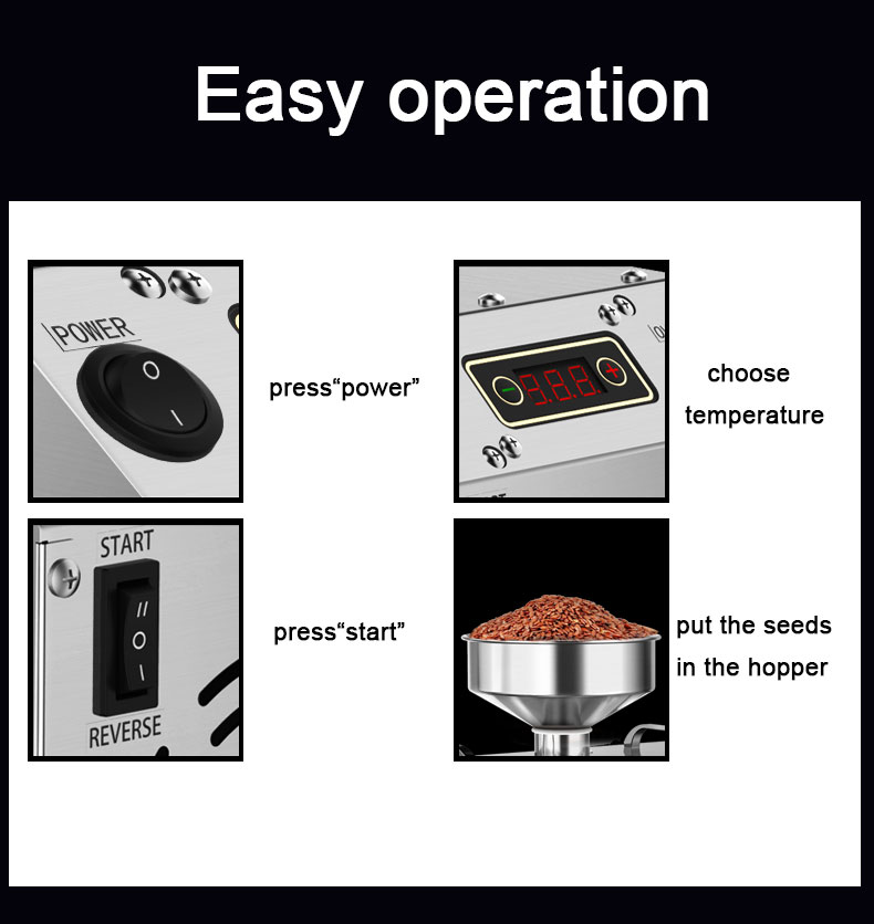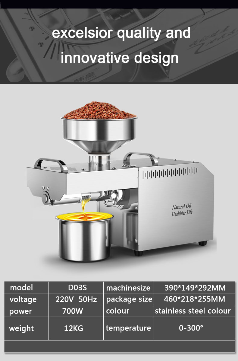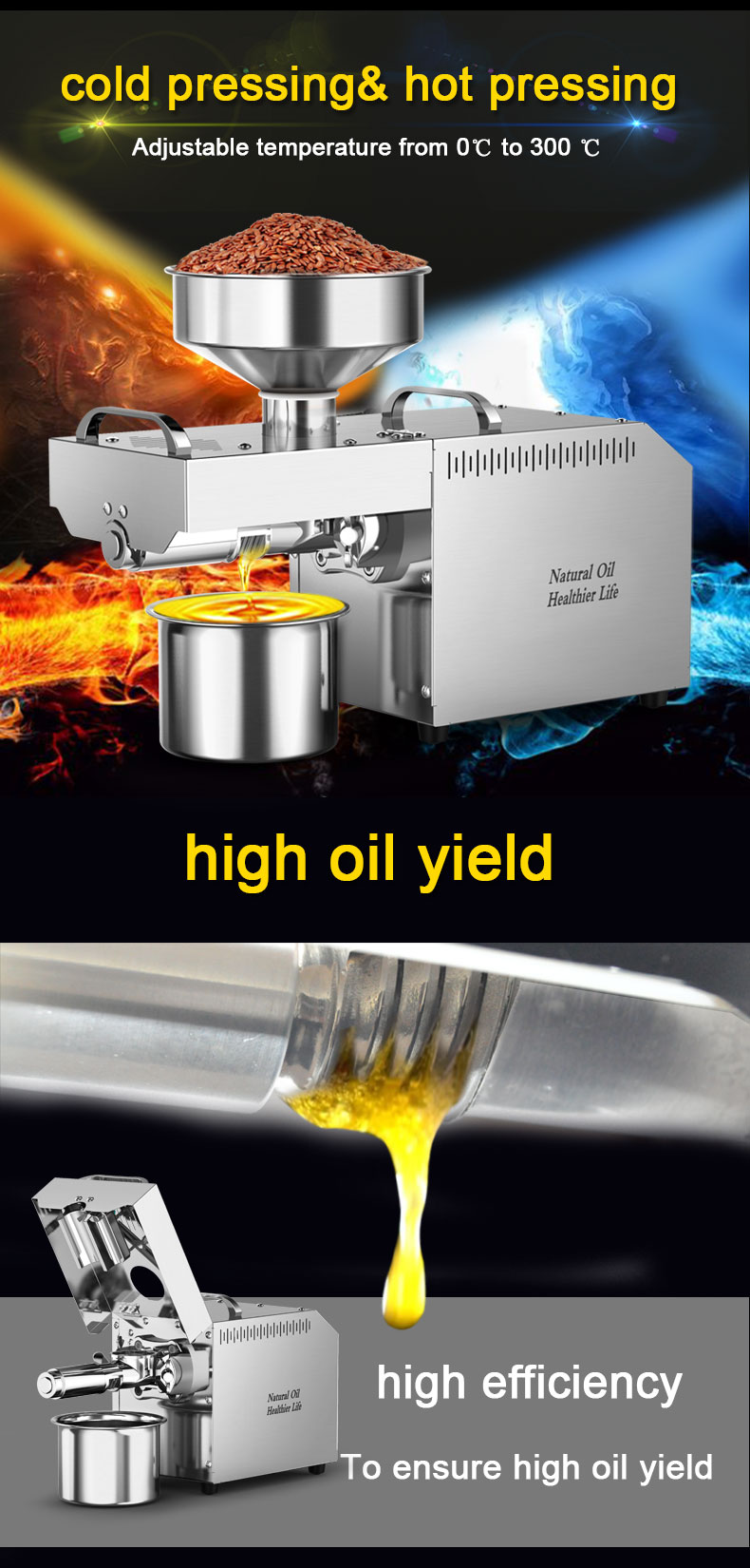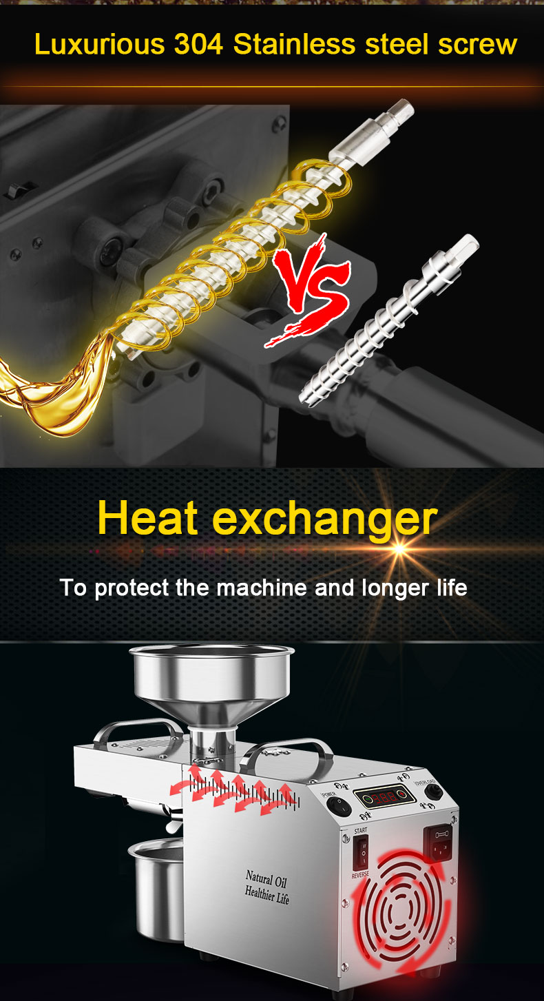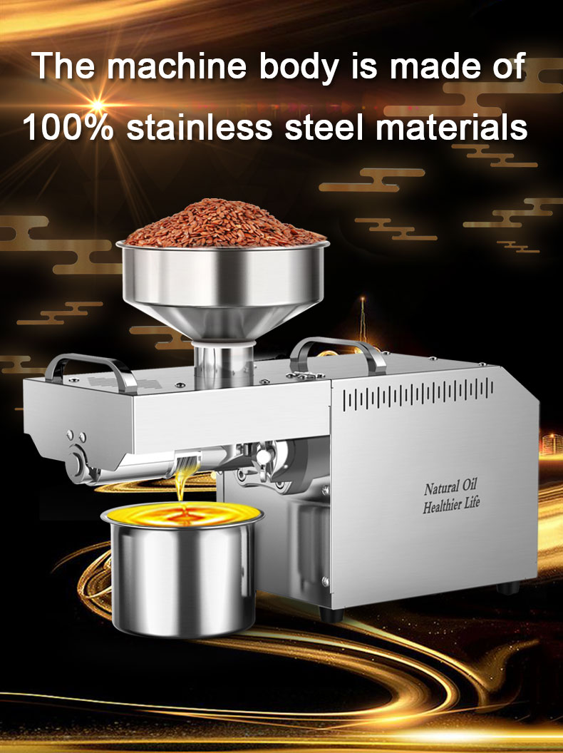 The oil press machine is constructed from high-quality stainless steel, making it durable, easy to clean, and resistant to corrosion.