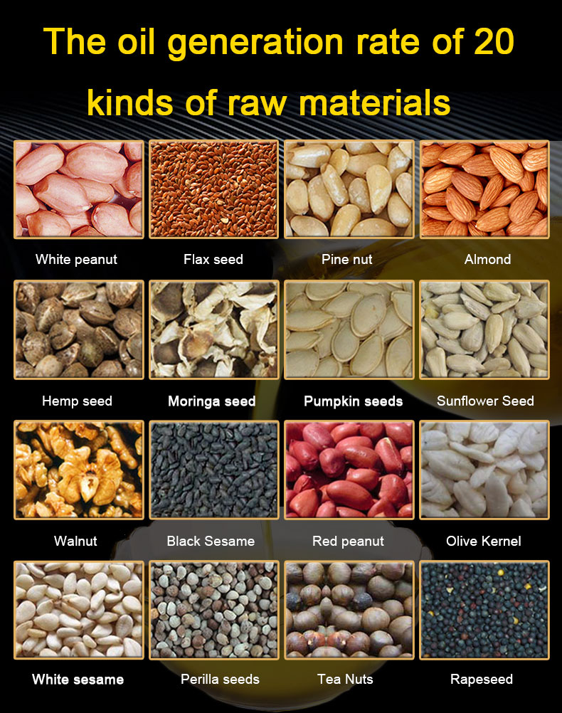 The machine is best suited for oil-bearing seeds such as peanuts, soybeans, and coconuts, but it can also handle a variety of other seeds.