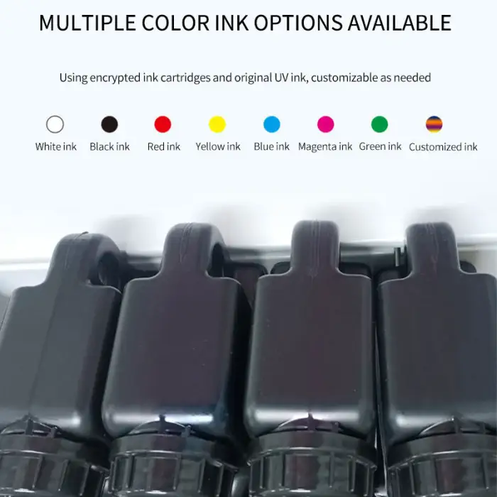 This printer uses UV ink, which is known for its durability and vibrant color output.