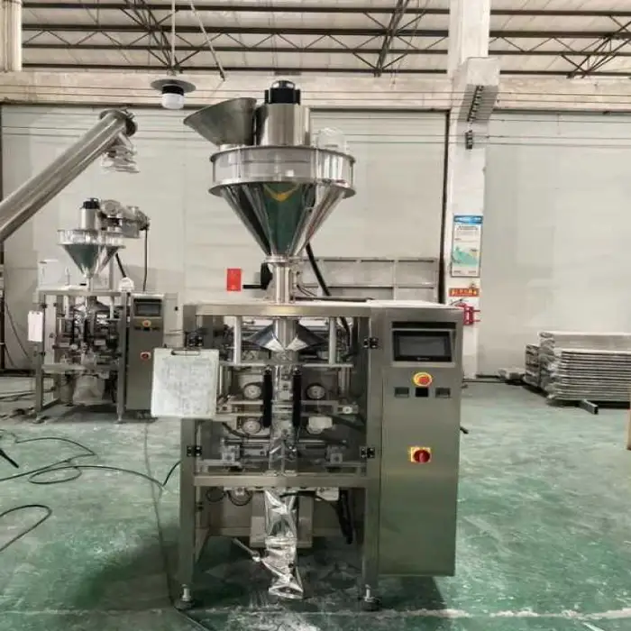 The machine is designed to package various powder products including coffee, spices, chemicals, and other commodities.