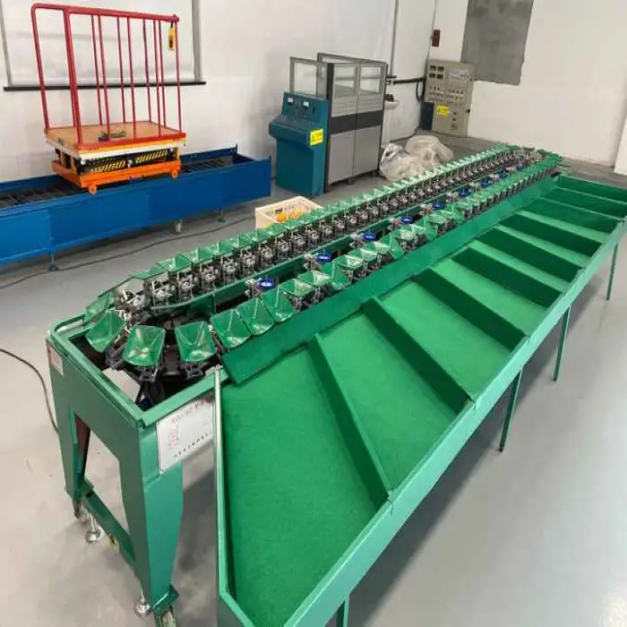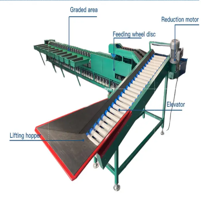 The machine sorts fruits based on weight, with an adjustable sorting interval ranging from 20 to 1500 grams.