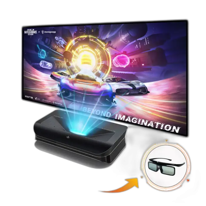 Ultra short throw (UST) means the projector can produce very large images from a very short distance from the screen or wall. Exact placement distances for specific screen sizes vary — refer to the user manual or seller specs for the throw ratio and recommended distances.