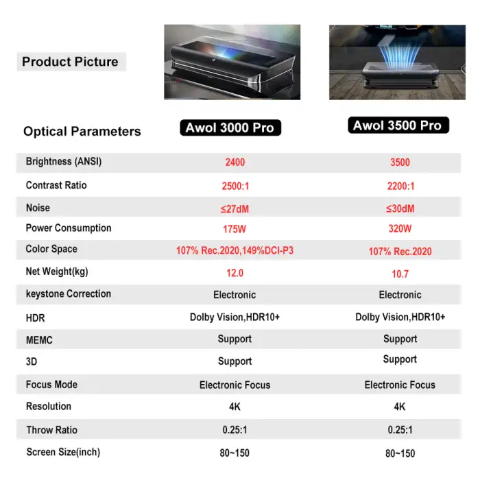 The AWOL 3000 3500 Pro uses a laser light source (marketed as a triple‑laser system), which provides a wide color gamut and longer operating life compared with traditional lamps.