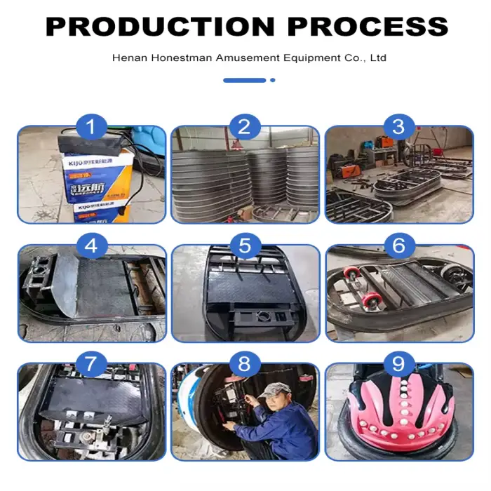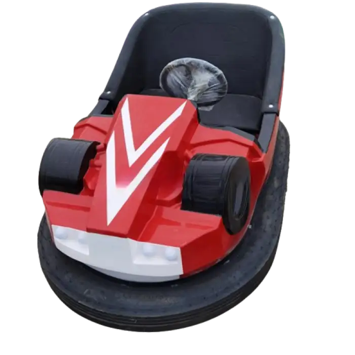 The bumper cars are made of durable fiberglass and steel for long-lasting use.