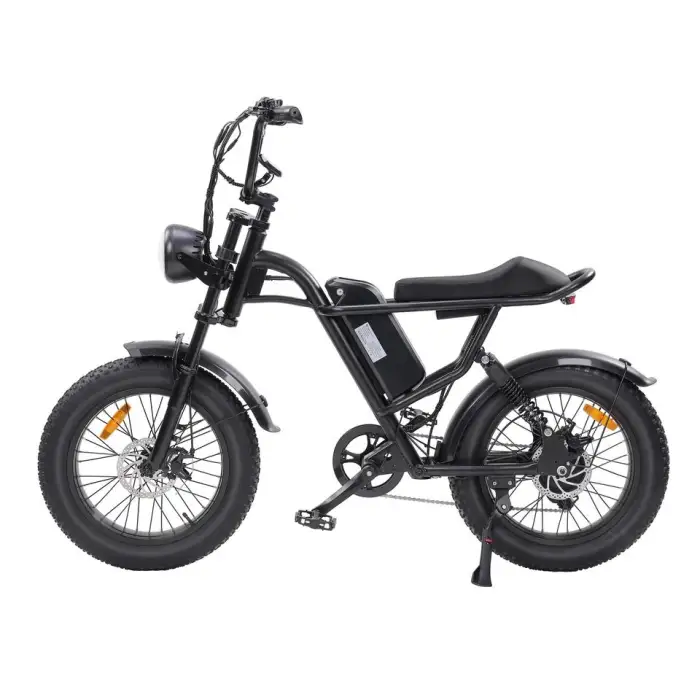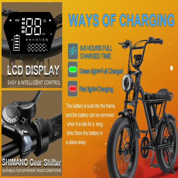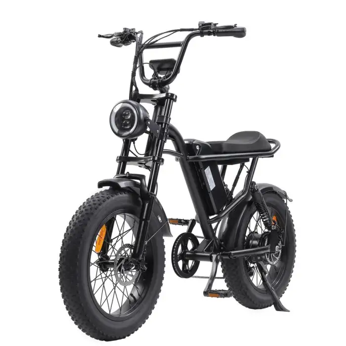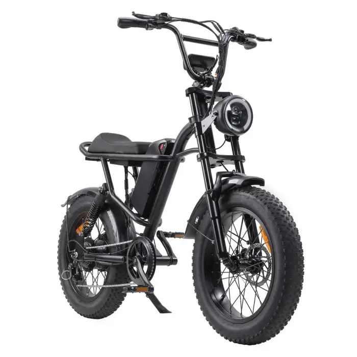 The bike is equipped with fat tires measuring 20 inches by 4 inches, which enhance stability and traction.
