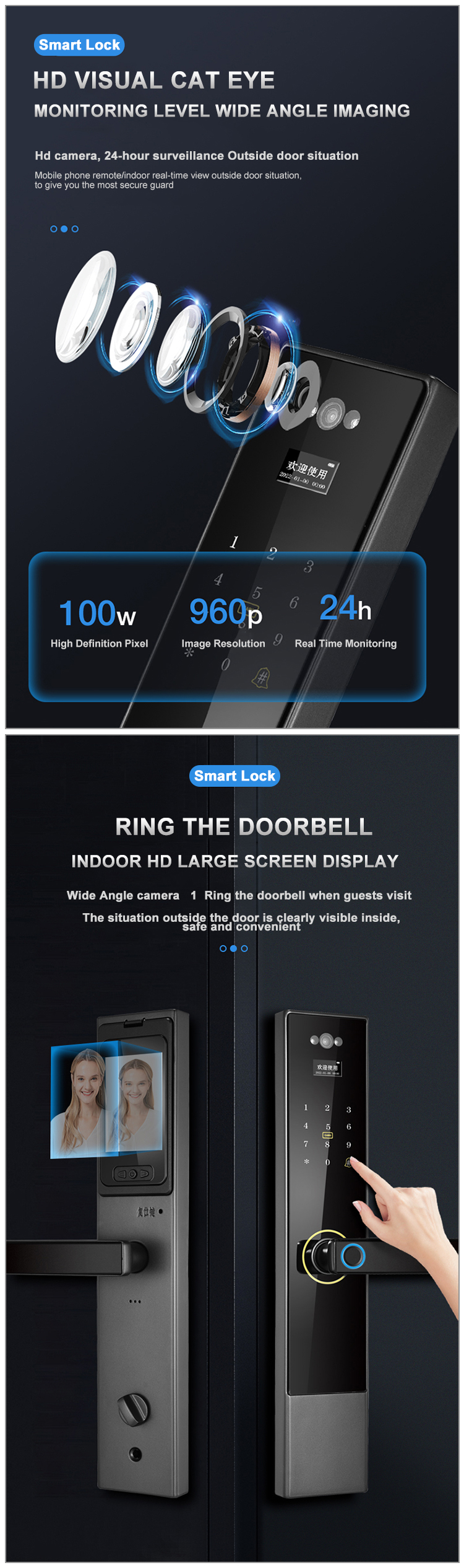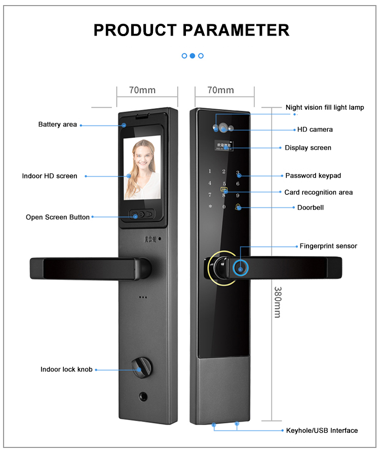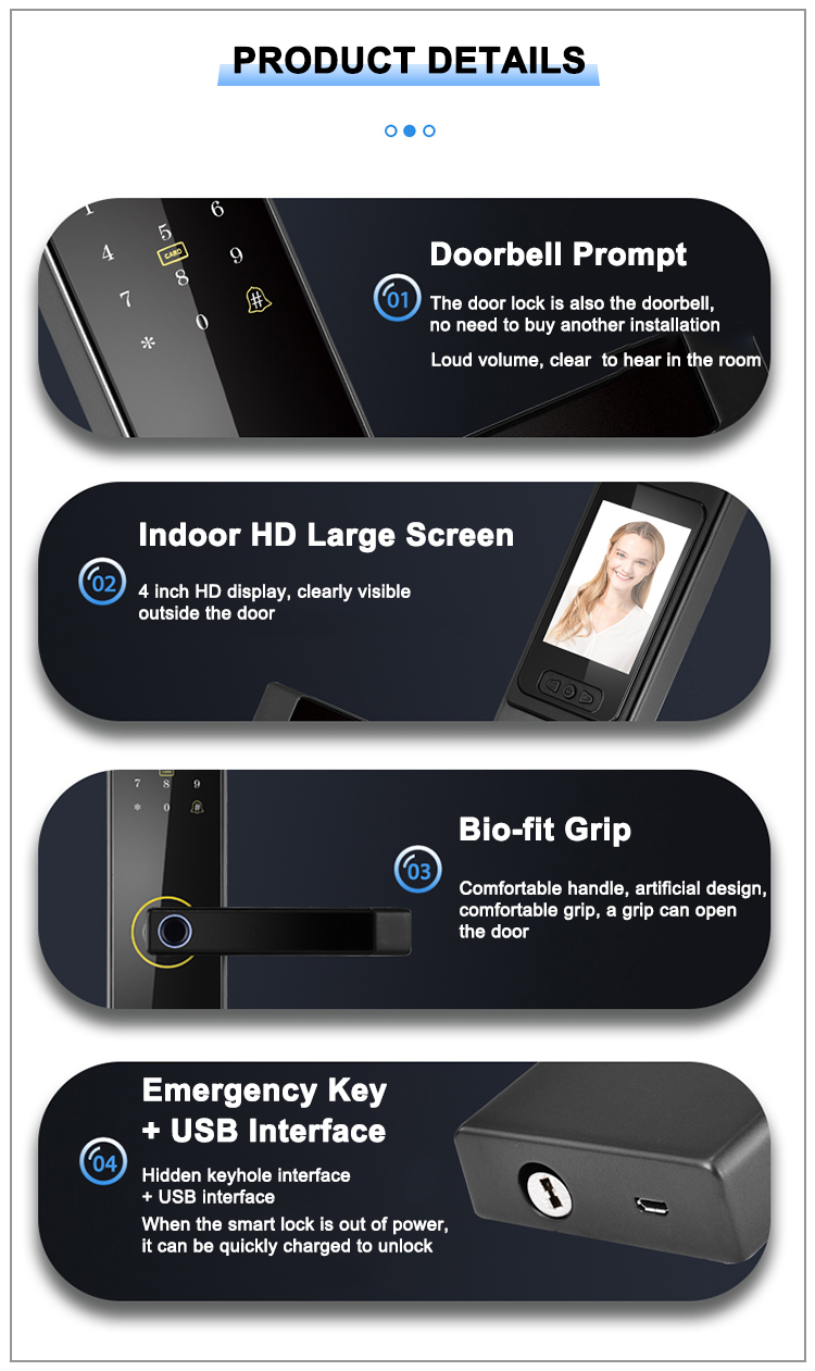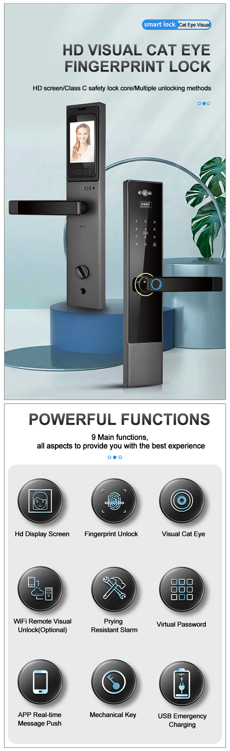 The main features include fingerprint recognition, password entry, card access, key entry, and mobile app control. It also has a remote visual cat eye function and supports emergency power supply through a mobile phone charging bank.