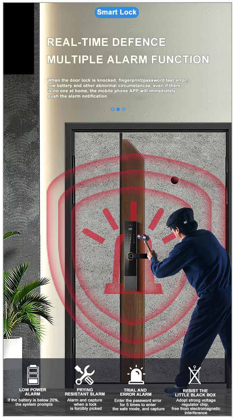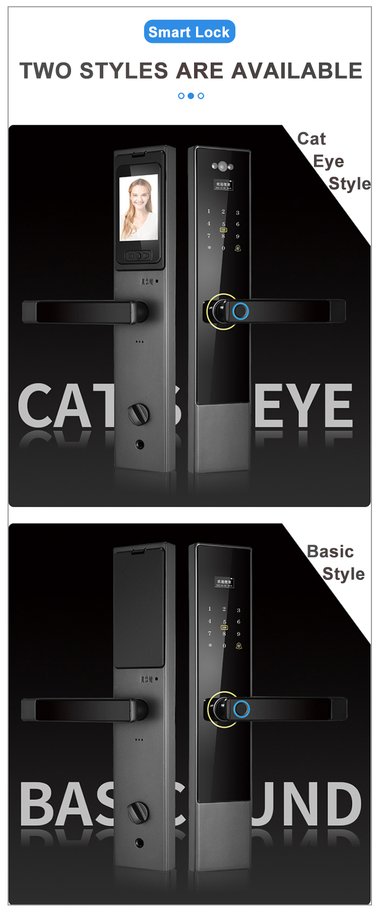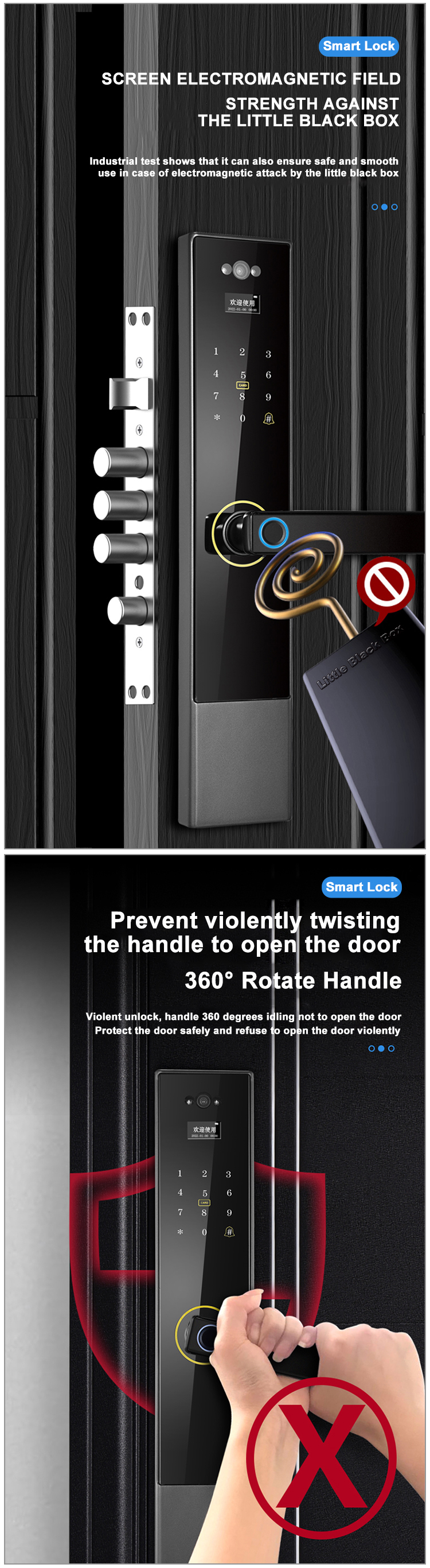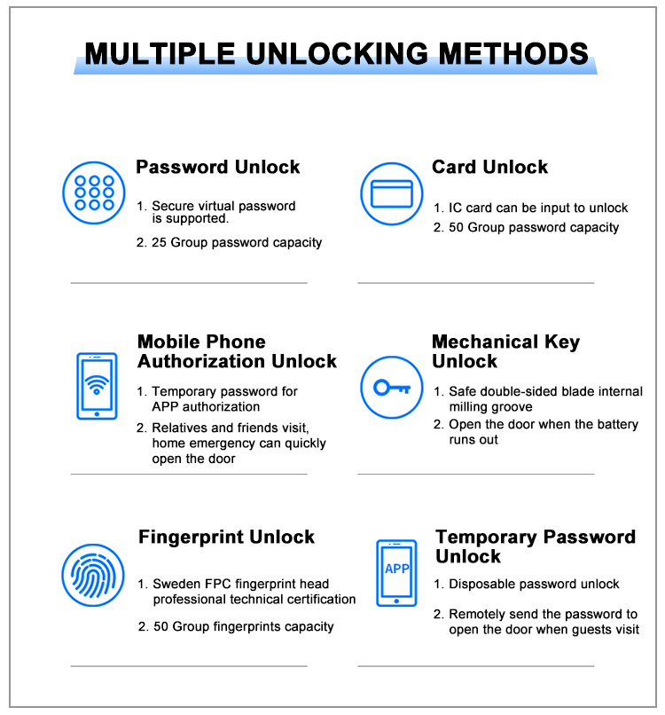 The main features include fingerprint recognition, password entry, card access, key entry, and mobile app control. It also has a remote visual cat eye function and supports emergency power supply through a mobile phone charging bank.