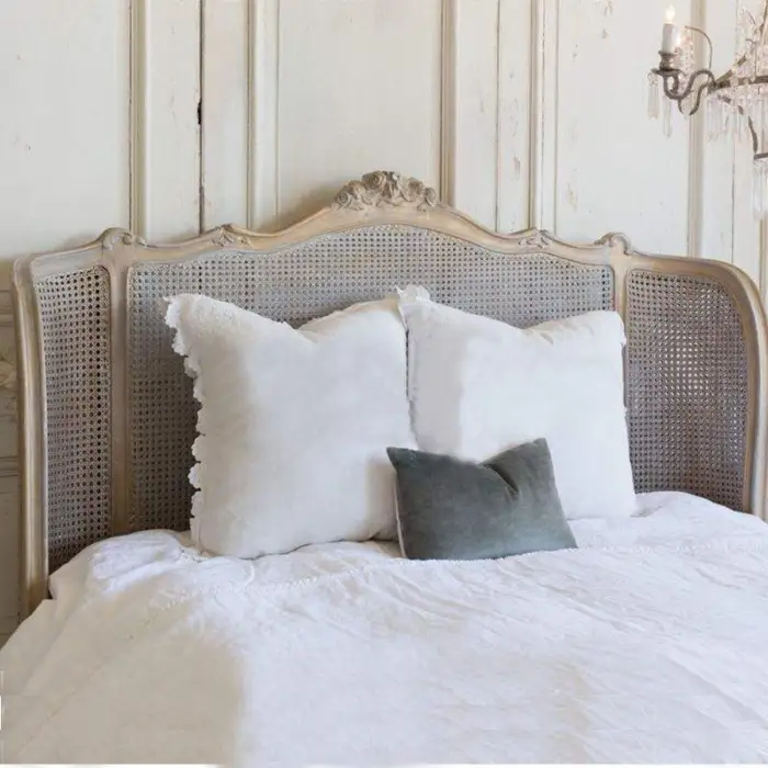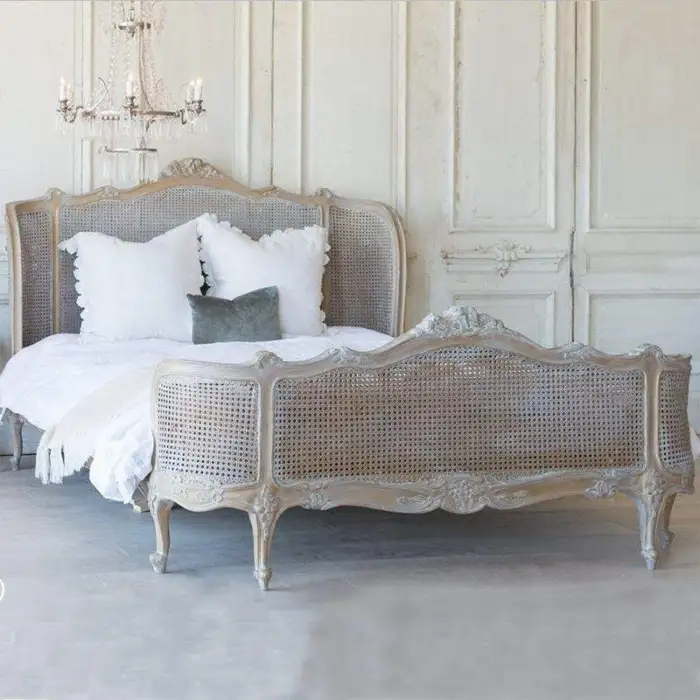 The bed is constructed from solid wood, ensuring durability and longevity. It also features carved rattan for an elegant design.