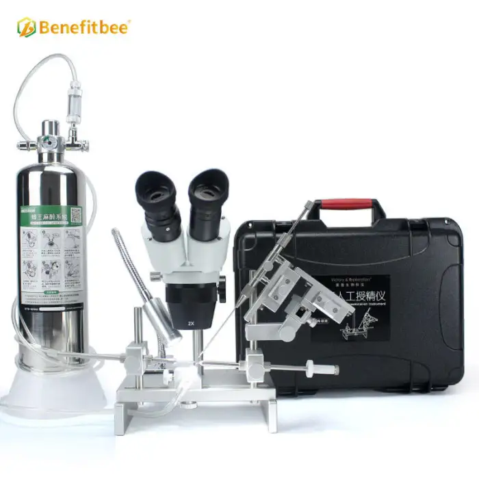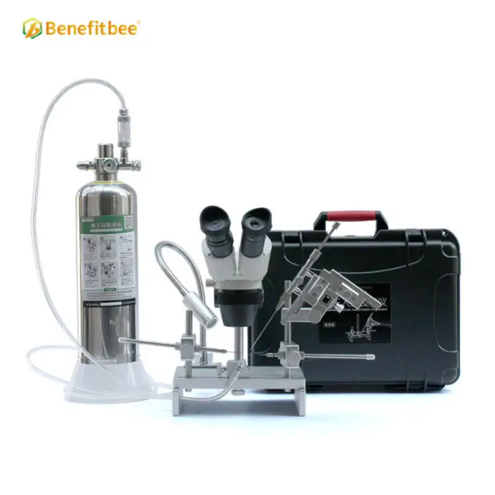 The kit includes a high-quality microscope and essential tools necessary for performing artificial insemination on queen bees.