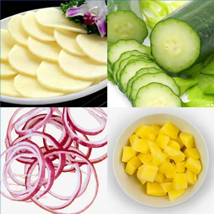 The machine supports multiple cutting modes including slicing, dicing (cubing) and shredding. Different blade sets or inserts allow you to vary cut size and style.