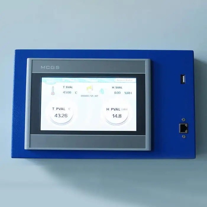 It uses a microcomputer PID controller for precise temperature and humidity control.