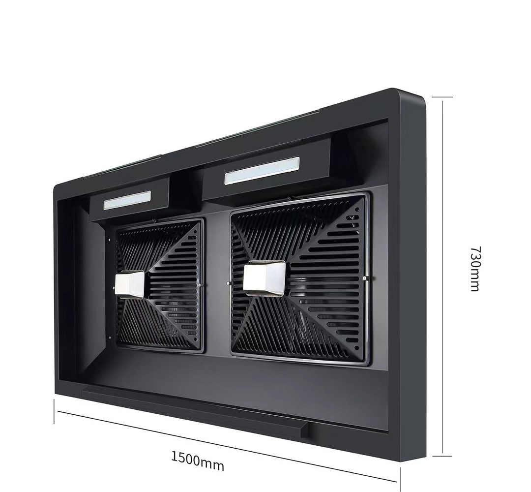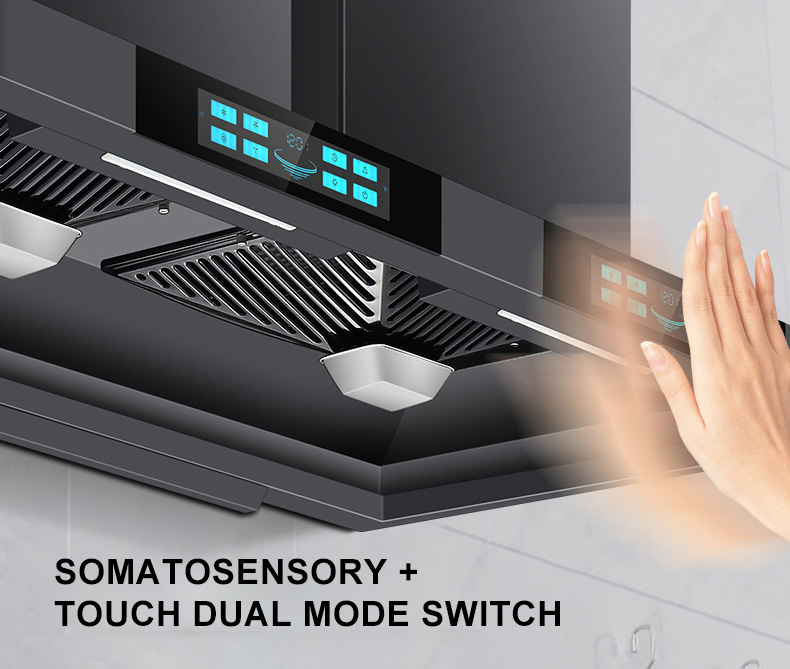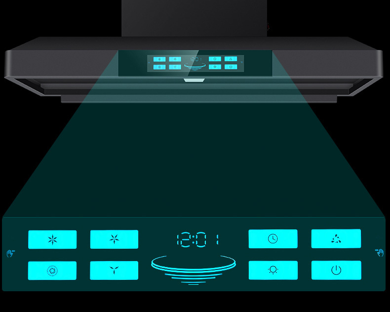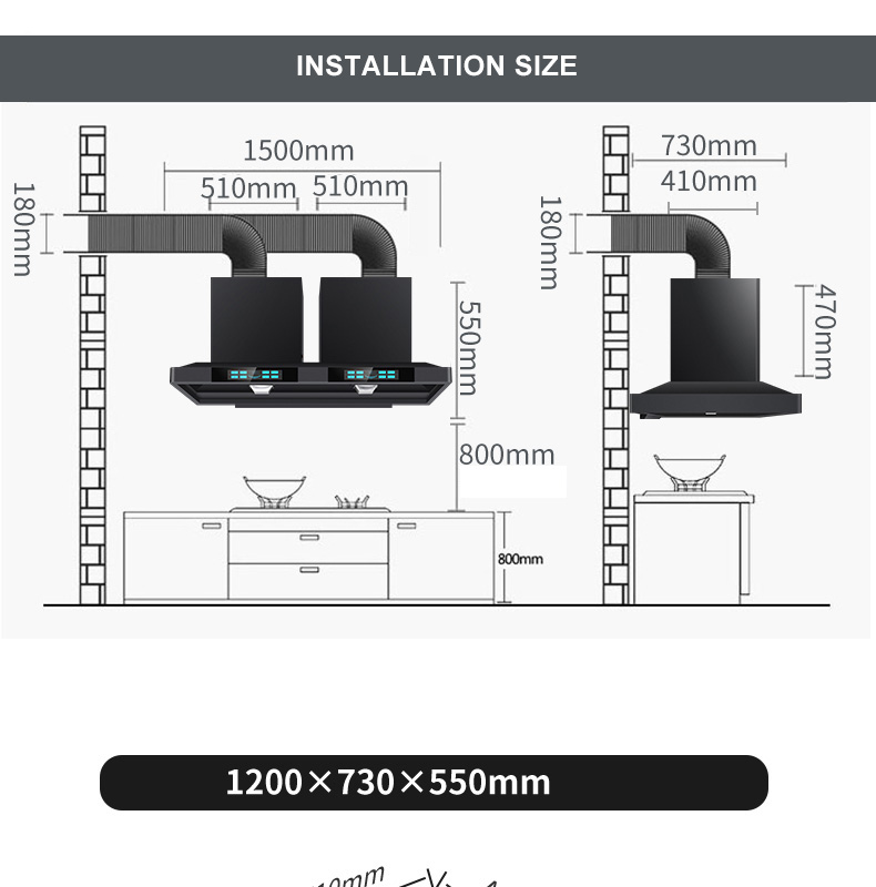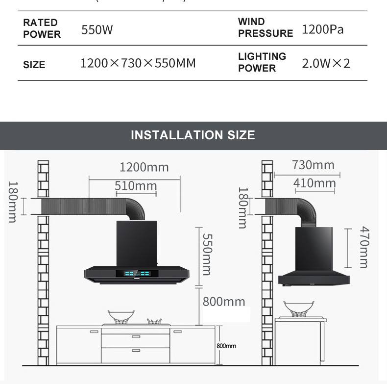 This is a wall-mounted (embedded) range hood that must be securely fixed to the wall and connected to a proper venting duct and power supply (220 V). Professional installation is recommended to ensure correct mounting, duct routing, and electrical connection.