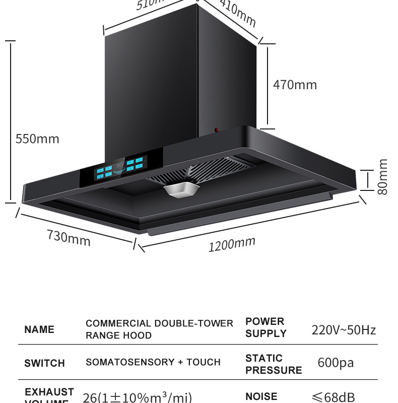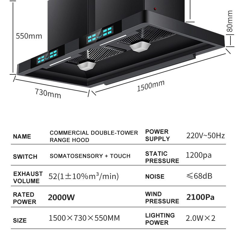 With an exhaust rate of around 15–17 m³/min and robust motor(s), the hood provides strong suction suitable for many commercial kitchens, hotels and larger household cooking areas. For very heavy-duty commercial applications, check your kitchen’s specific ventilation requirements.