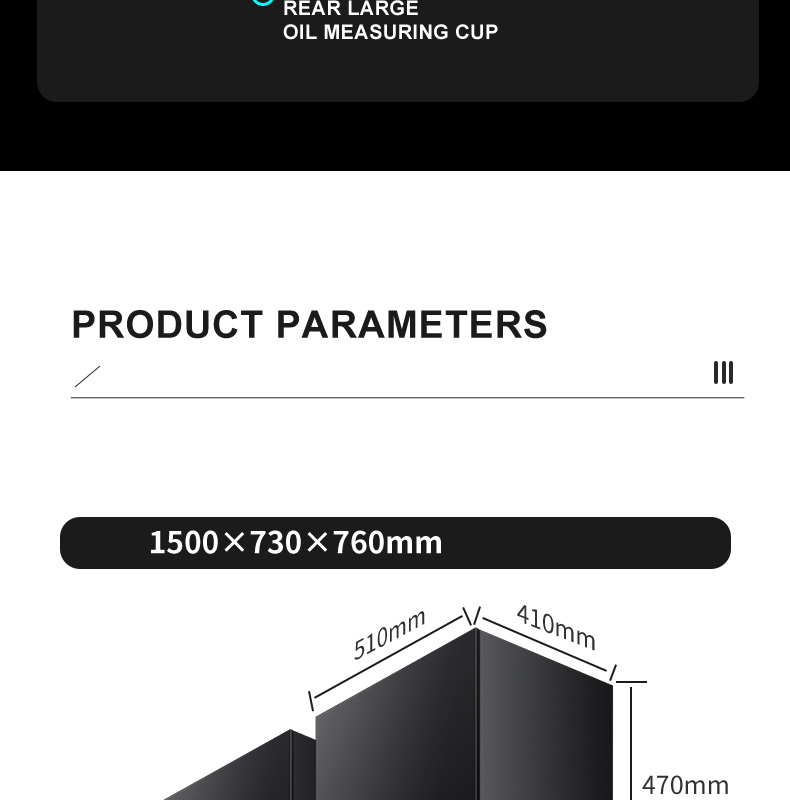 The CXW-286-326 has a stainless steel body with a black crystal glass panel, dimensions 1500 x 730 x 610 mm, rated power about 500 W, voltage 220 V, and an air exhaust rate of approximately 15–17 m³/min. It is wall-mounted and designed for medium to large kitchens.