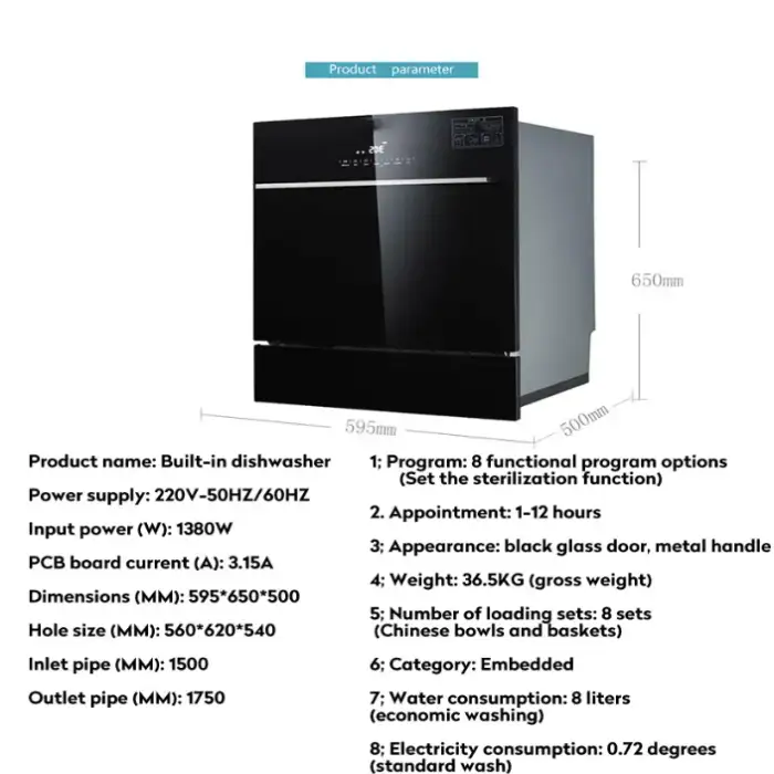 The dishwasher comes with 8 functional program options, including heavy-duty cycles, quick wash for lightly soiled items, and gentle settings for delicate glassware.